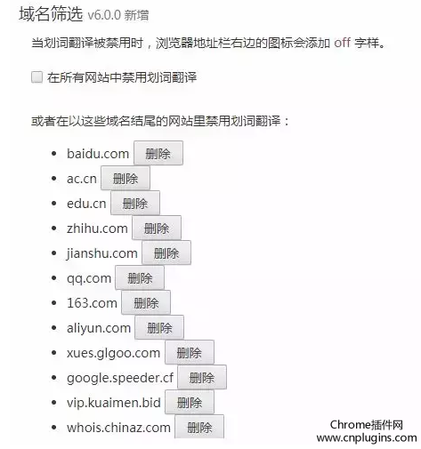 5.还可以设置划词翻译在某些网站中自动禁用翻译功能,避免干扰选取文字内容,例如在经常使用的中文网站中就可以自动禁用这个插件。